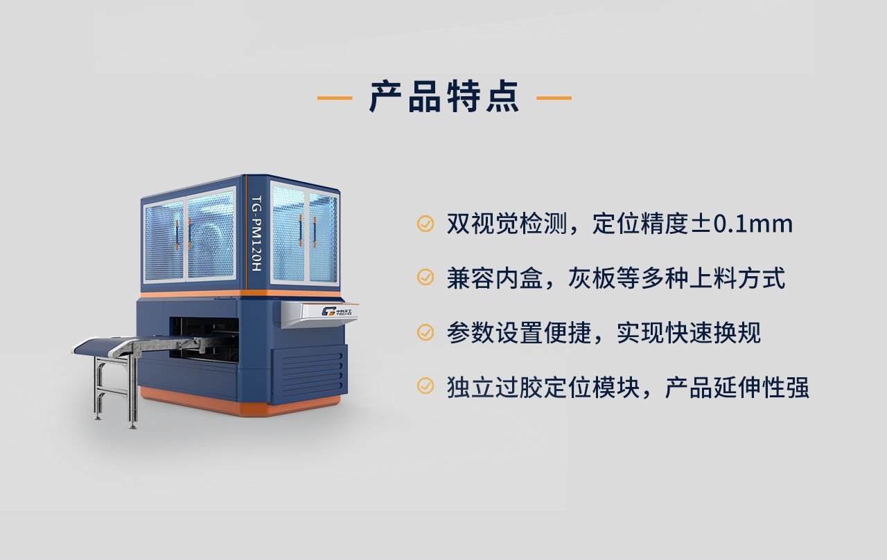 TG-PM120P型全智能三合一定位機應用于煙包、禮品盒行業等生產線,適用于多種工藝的定位,可實現天地盒、皮殼、抽屜盒、異形盒等產品的精準定位,適用于各種需要過膠定位的高檔精品盒,皮殼可實現單片、多片灰板的定位。