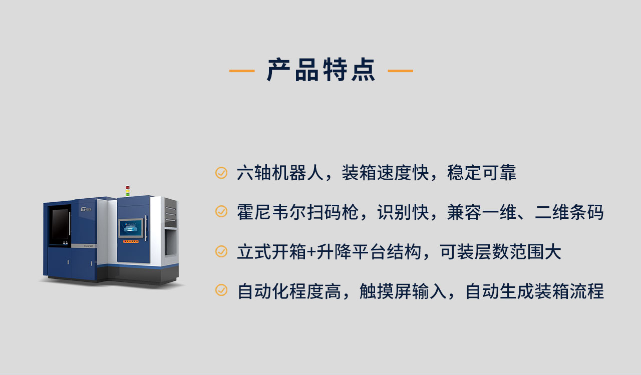 TG-3C50Z全自動裝箱機應用于3C電子行業、化妝品、高端首飾等生產線的即時在線裝箱,一次性完成開箱、裝箱、計量、檢測,放隔板、封箱、自動打標,自動碼垛(選配)等功能,與前后道工序實現柔性連接。